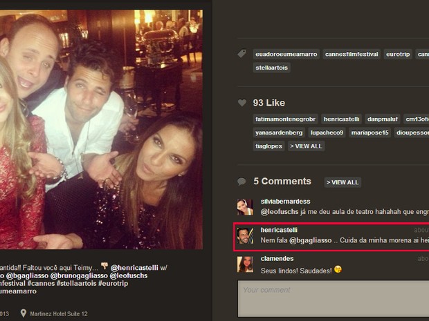 Por lá, fotos em redes sociais mostram que o relacionamento entre os dois é sério e de conhecimento de amigos famosos, comoBruno Gagliasso, que mandou recadinho em uma foto para o amigo. “Diversão garantida” Faltou você aqui Teimy (apelido de Henri)”, escreveu para receber como resposta do ator de “Flor do Caribe”. “Nem fala, Gagliasso.. Cuida bem da minha morena aí, hein”, escreveu ele para o amigo que também está em Cannes.