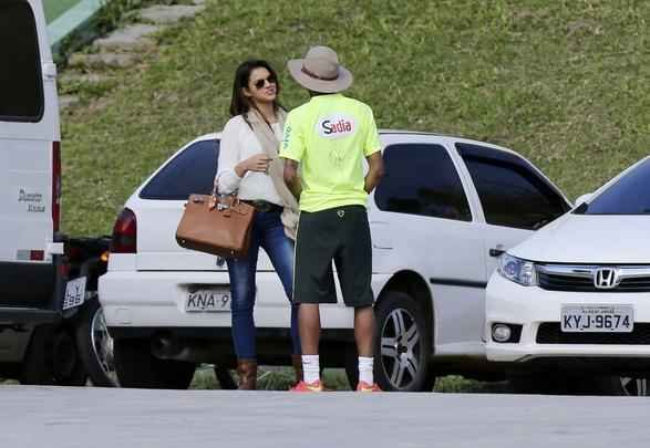 Ele chegou a colocar o chapéu de Bruna e fez algumas brincadeiras. Depois, ambos posaram para fotos juntos. O encontro foi breve e em seguida eles se separaram. O jogador se encaminhou ao vestiário, enquanto ela entrou em um veículo.